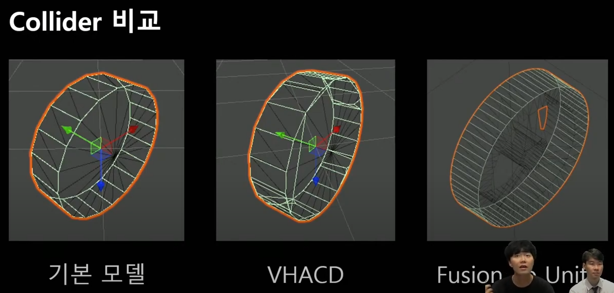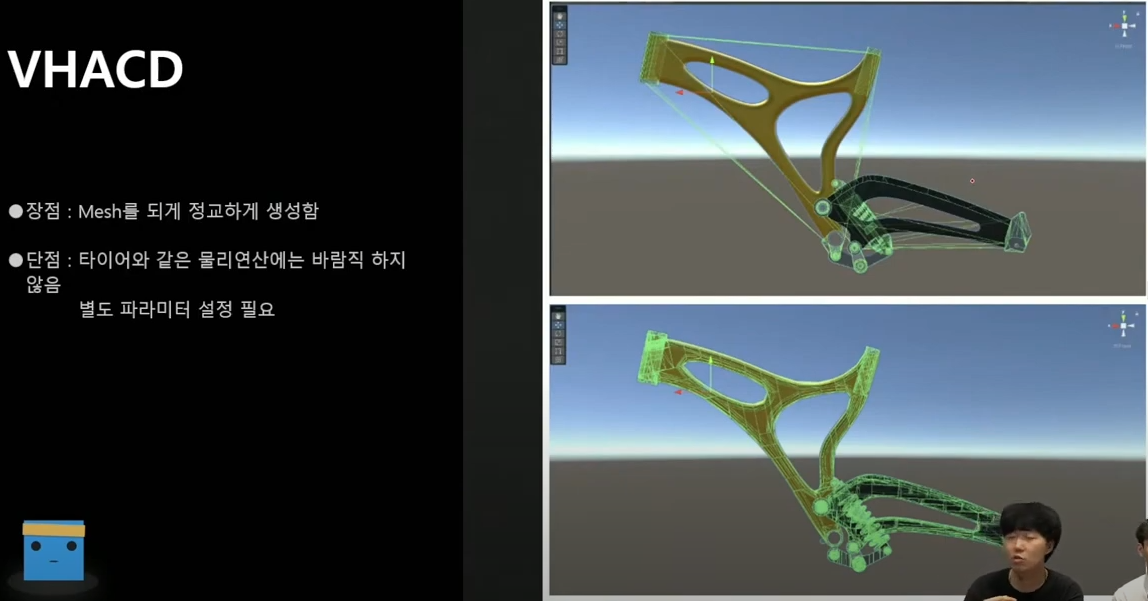 VHACD방식은 오브젝트의 메쉬콜라이더를 여러개 생성한다. 삼각형 갯수 제한이 있는건 마찬가지지만 여러개로 나누어 생성하는 듯하다. (VR이나 AR에서 물체를 손으로 잡는 프로젝트에서 많ㅇ이 사용한다.)