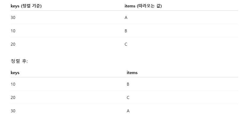 arr1이 우리가 알던 방식으로 정렬되고 arr2가 arr1기준으로 같은 인덱스 로 나열된다