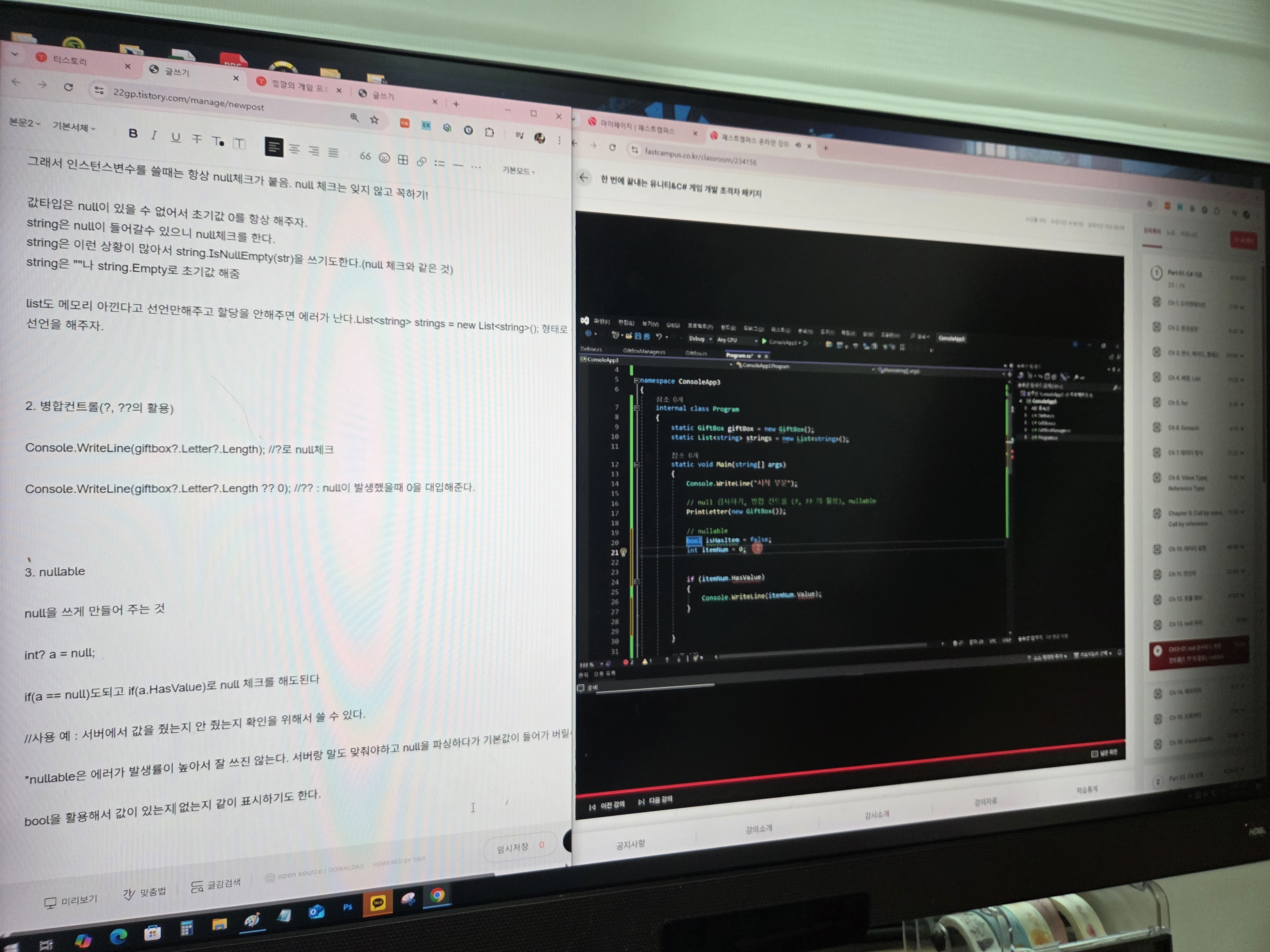 오늘은 null검사하기, 병합 컨트롤(?, ??의 활용), nullable을 배웠다.