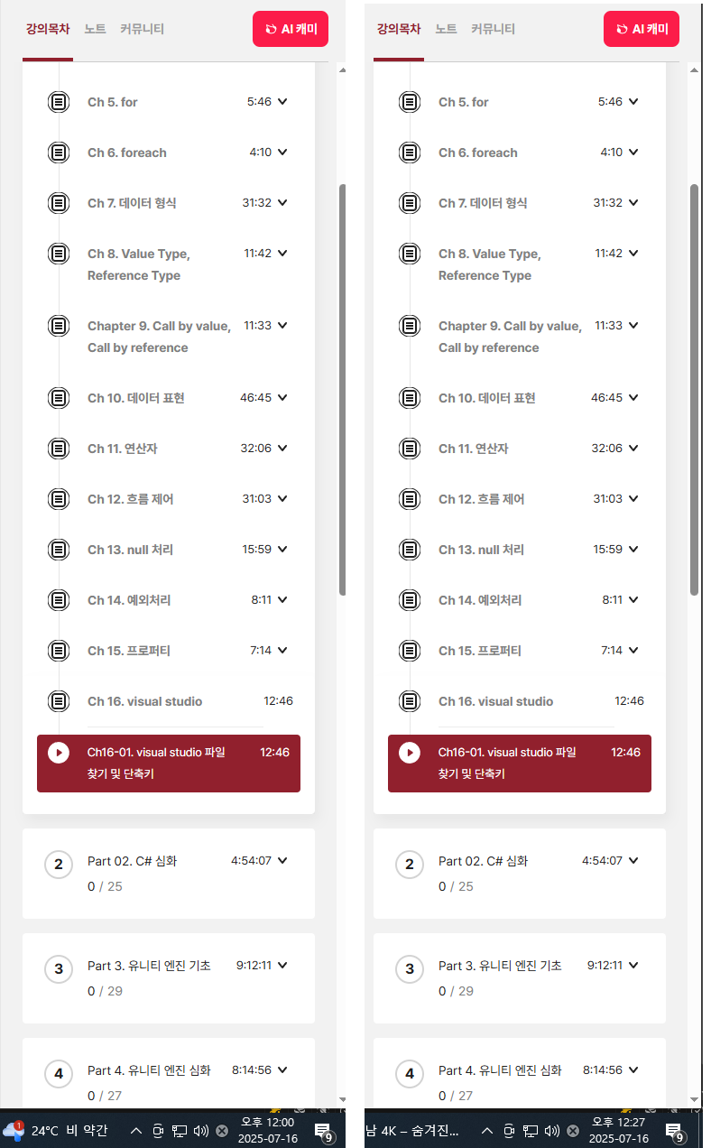 | 17일차 : '한 번에 끝내는 유니티&C# 게임 개발 초격차 패키지' 강의 후기 (4) | 2025.07.17 |