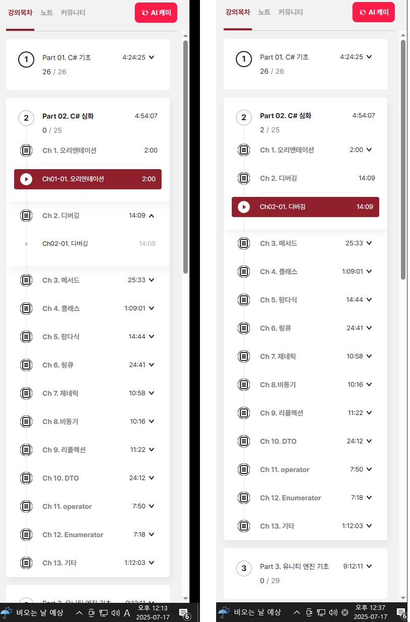 | 19일차 : '한 번에 끝내는 유니티&C# 게임 개발 초격차 패키지' 강의 후기 (4) | 2025.07.19 |