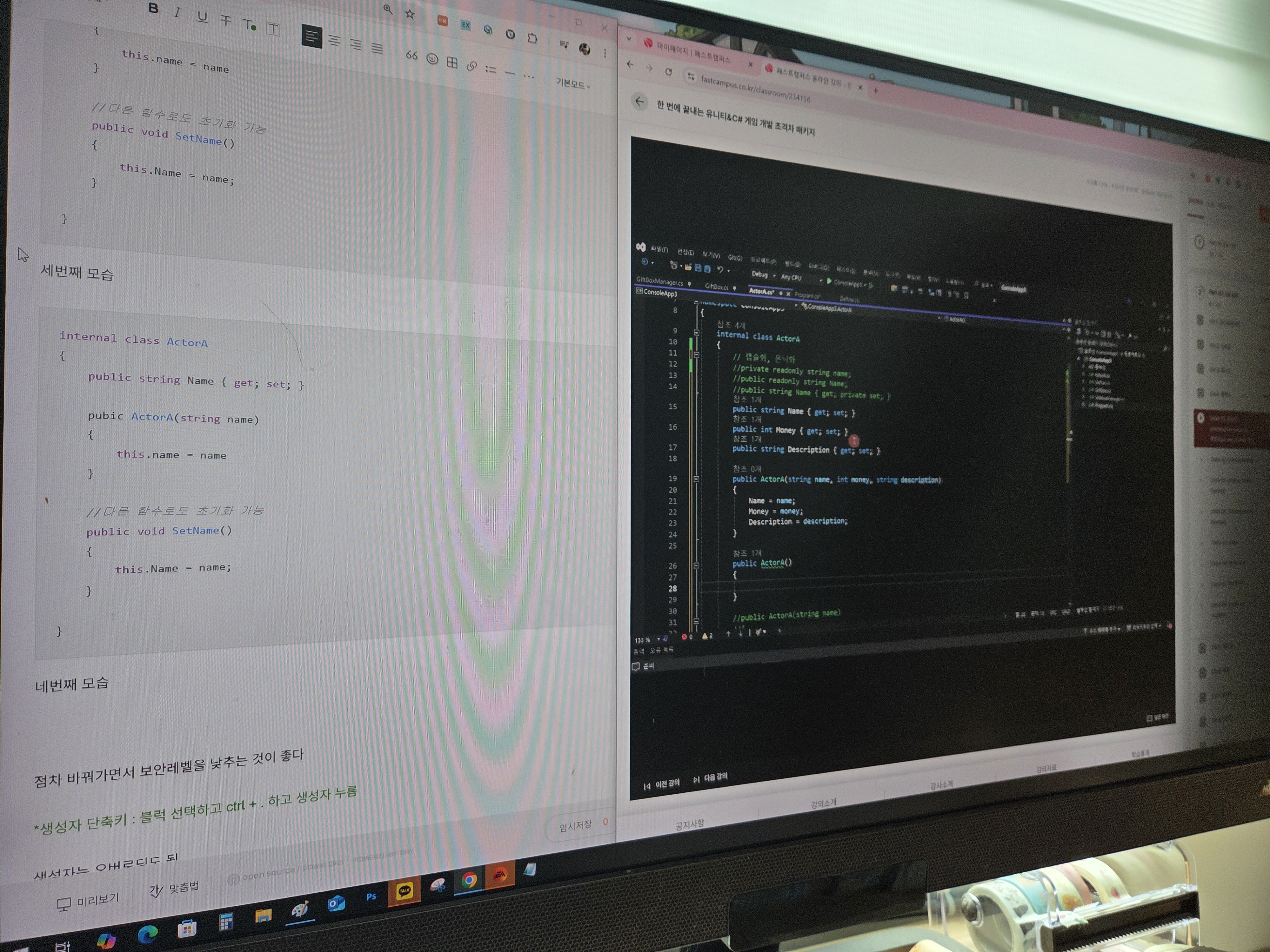 첫번째 클립에서 배우는 내용은 3가지였는데 부드럽게 이어지면서 과정 중에 섞어 쓰셔서 3가지를 동시에 잘 배운 느낌이었다. readonly를 먼저 쓰시면서 설명을 해주셨고 생성자를 씀과 동시에 this를 사용하는 방식의 수업이었다. 물론 구조상 특히나 생성자와 this는 같이 쓸 수밖에 없긴 하지만 자연스럽게 설명을 잘해주신 것 같다. 오늘의 실무적인 예로는 프로그램마다 달라지겠지만 처음에만 초기화를 세팅해 놓고 쓰는 클래스들이 많다고 하셨고 어떤 서버쪽에서는 초기화를 다 시켜놓고 클래스는 그 역할로만 쓰는 경우가 많다고 하셨다.