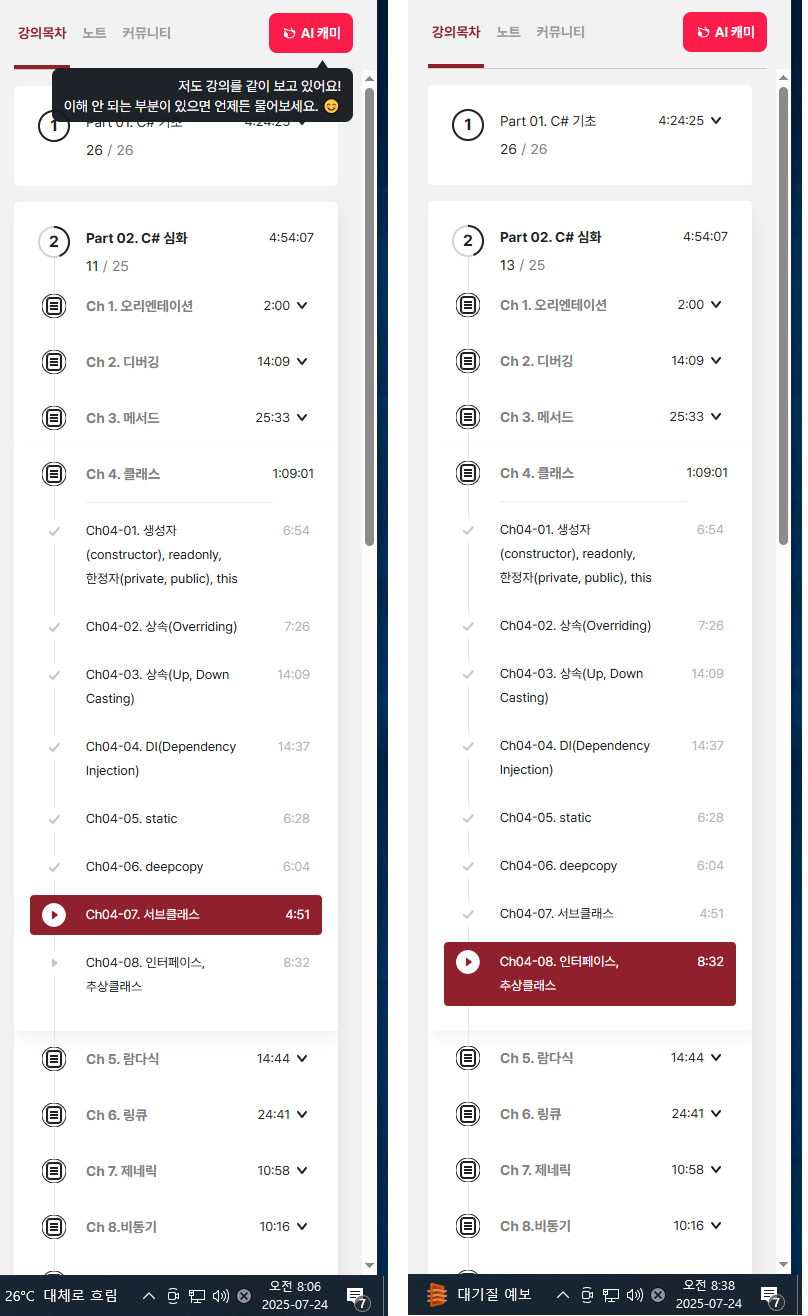 | 25일차 : '한 번에 끝내는 유니티&C# 게임 개발 초격차 패키지' 강의 후기 (3) | 2025.07.25 |