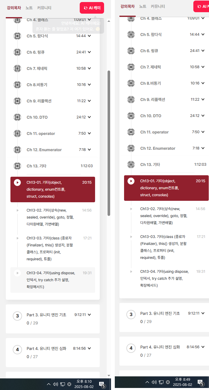 | 35일차 : '한 번에 끝내는 유니티&C# 게임 개발 초격차 패키지' 강의 후기 (7) | 2025.08.04 |