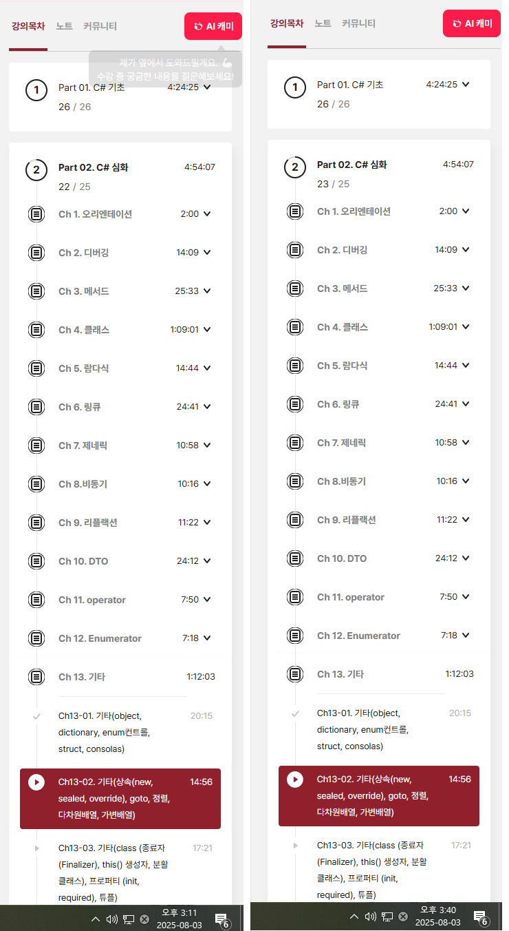 | 35일차 : '한 번에 끝내는 유니티&C# 게임 개발 초격차 패키지' 강의 후기 (7) | 2025.08.04 |