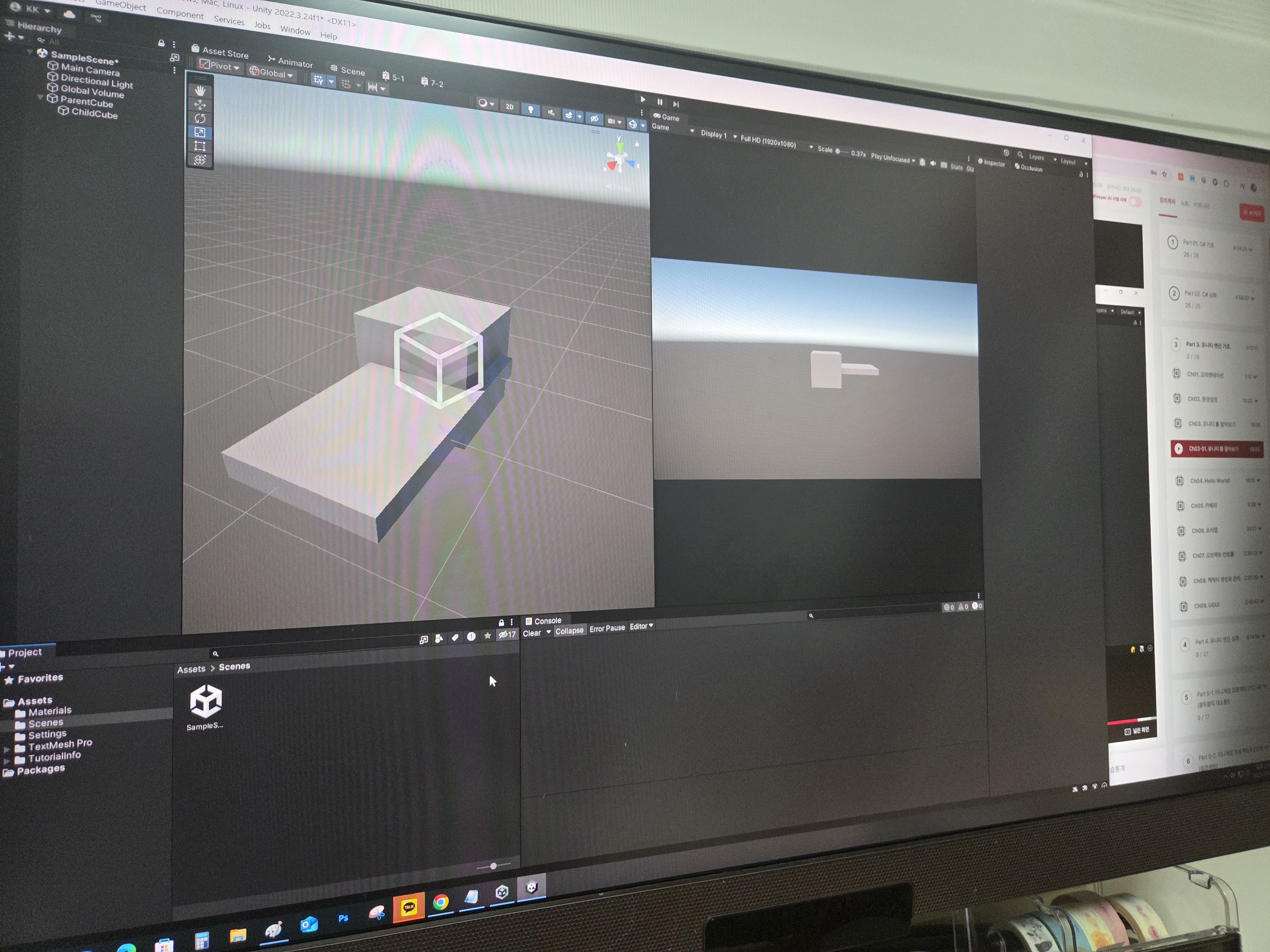 마지막으로 오브젝트 간의 부모 자식 관계에 대해서도 배웠다. 부모 오브젝트를 움직이면 자식 오브젝트도 함께 움직이게 되고, 계층 구조를 활용하면 씬 정리도 깔끔하게 할 수 있었다. 이런 기본적인 기능들을 확실히 익혀두면 앞으로의 프로젝트 진행이 훨씬 수월해질 것 같았다.