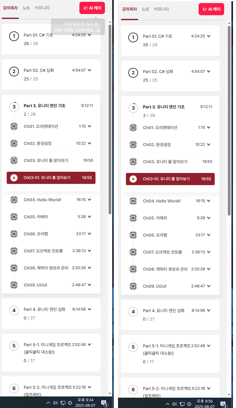 | 35일차 : '한 번에 끝내는 유니티&C# 게임 개발 초격차 패키지' 강의 후기 (7) | 2025.08.04 |