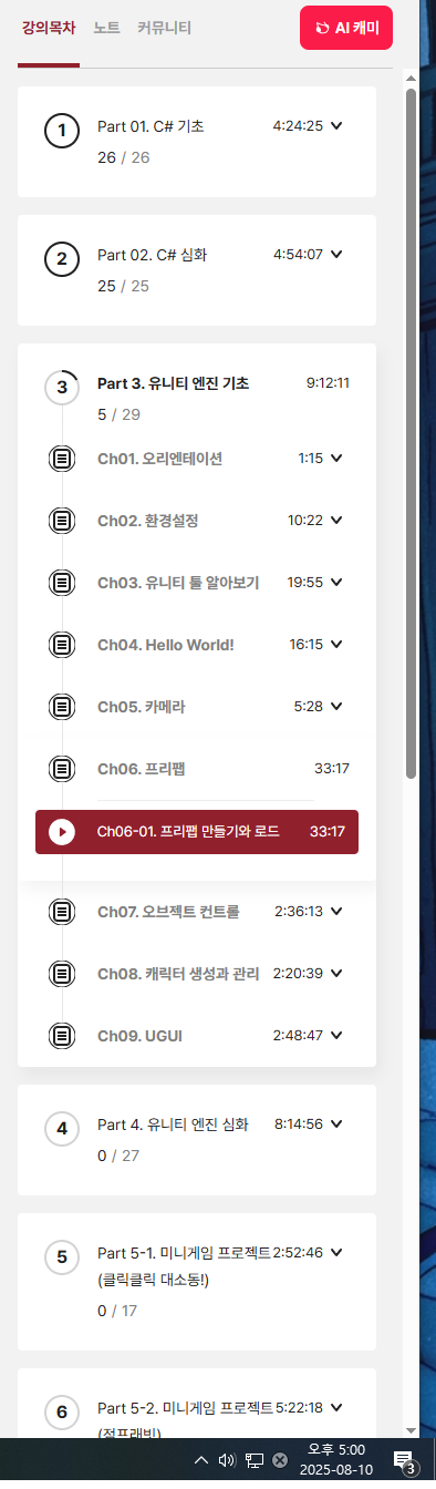 | 42일차 : '한 번에 끝내는 유니티&C# 게임 개발 초격차 패키지' 강의 후기 (2) | 2025.08.11 |