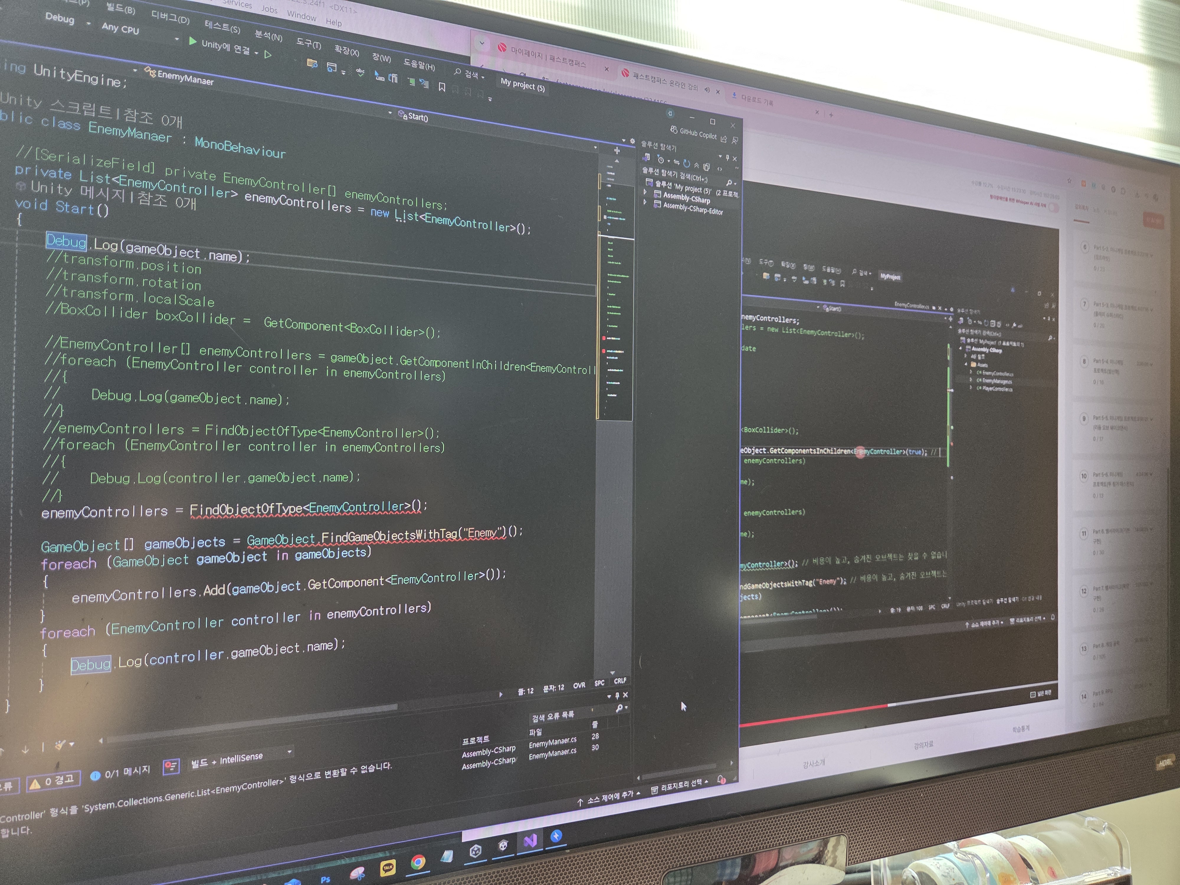 또 매니저를 통해 오브젝트와 기능을 한곳에서 관리하는 방법도 배웠다. 프리팹을 매니저에서 생성하고, 그 안에 필요한 초기화 과정을 묶어두면 어디서 호출하든 동일한 조건으로 오브젝트를 만들 수 있었다. 이렇게 중앙집중식으로 관리하면 유지보수가 훨씬 쉬워지고, 나중에 구조를 변경해야 할 때도 한 곳만 수정하면 전체에 반영할 수 있었다.