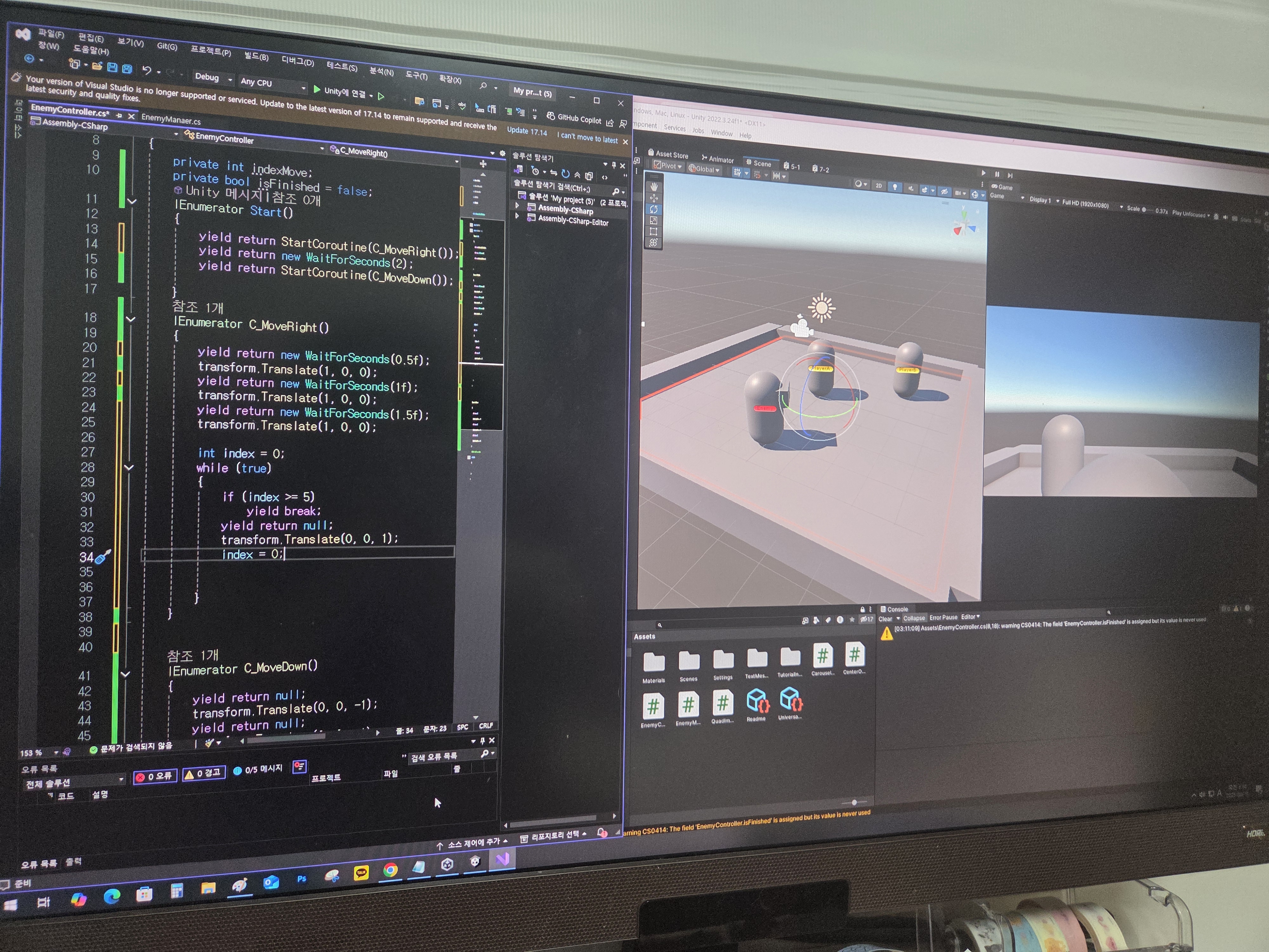 Start를 IEnumerator로 선언하면 Start 자체가 코루틴으로 동작한다는 것도 알게 되었다. 이렇게 하면 오브젝트가 활성화될 때부터 자연스럽게 “yield return” 들을 따라 순서대로 일이 진행되었다. yield return null은 한 프레임 기다린다는 뜻이었고, WaitForSeconds는 게임 내 시간으로 N초를 기다라는 것이다.