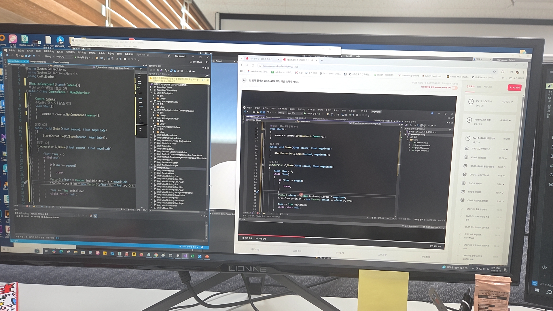 오늘은 유니티에서 카메라 쉐이크(Camera Shake) 효과를 구현하는 방법을 배웠다. 단순히 화면을 흔드는 것 같지만, 실제로는 연출의 몰입감을 크게 높여주는 중요한 기술이라는 걸 느꼈다. 폭발이 터질 때, 총을 발사할 때, 혹은 강한 충돌이 일어날 때 카메라가 순간적으로 흔들리면 플레이어는 훨씬 더 현실적인 타격감을 느낄 수 있다.