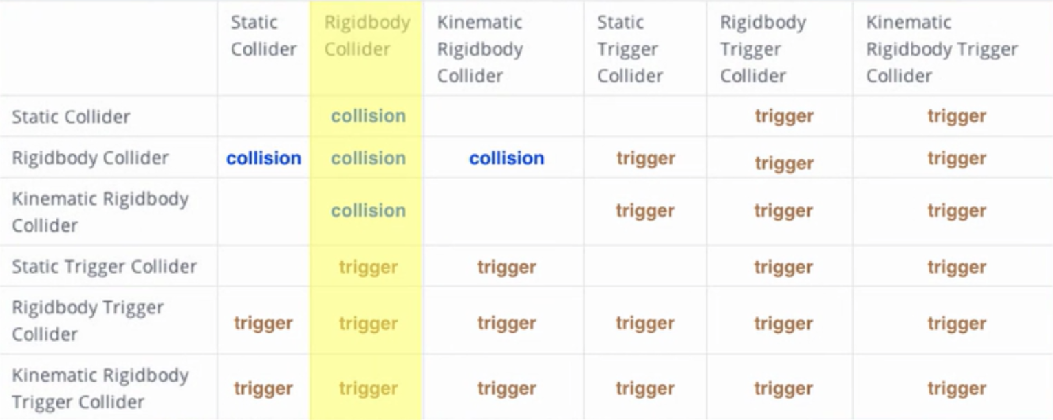 충돌을 하려면 충돌범위를 지정해주는 콜라이더와 리지드바디라는 강체(둘 중 하나는 있어야 함)가 필요함