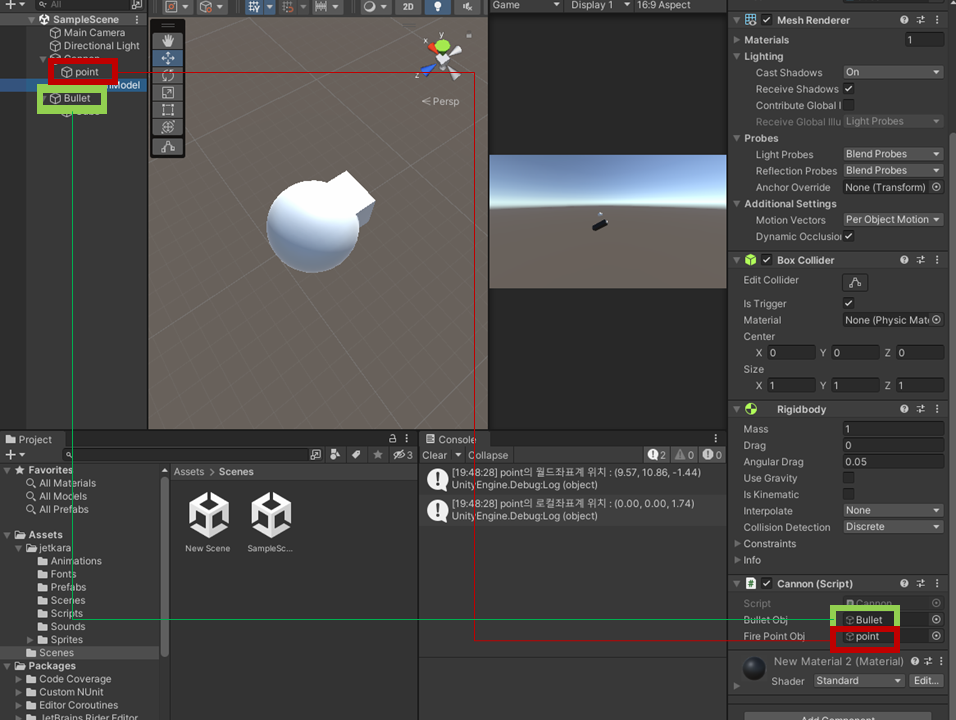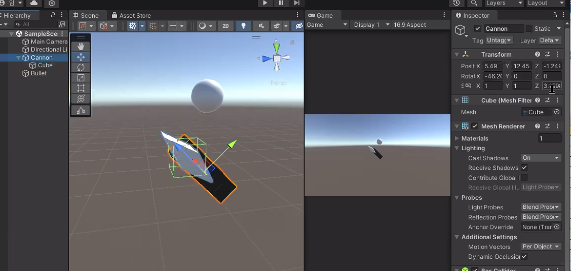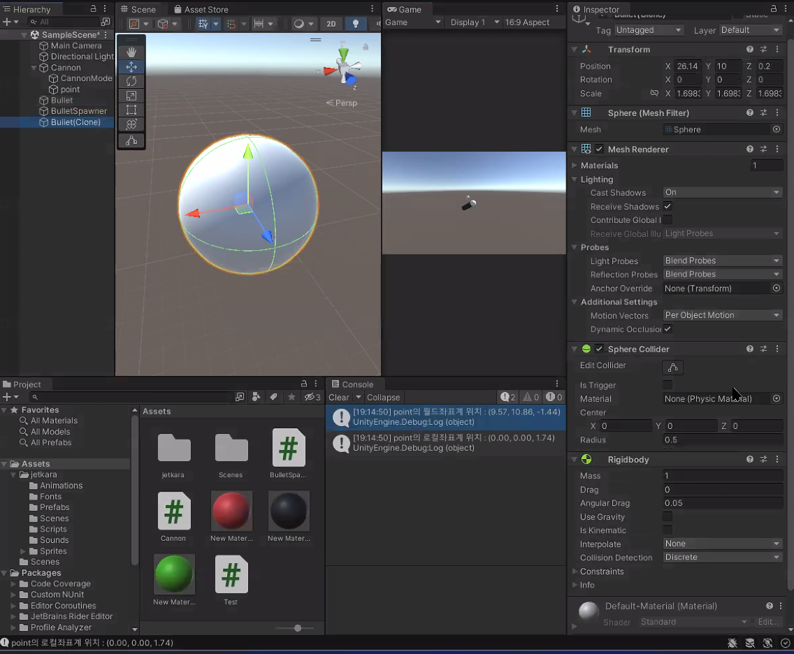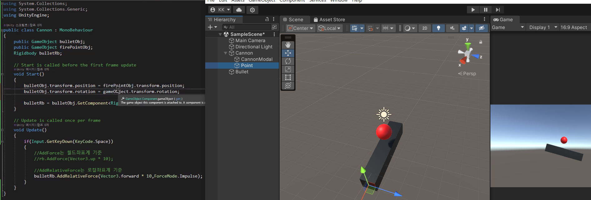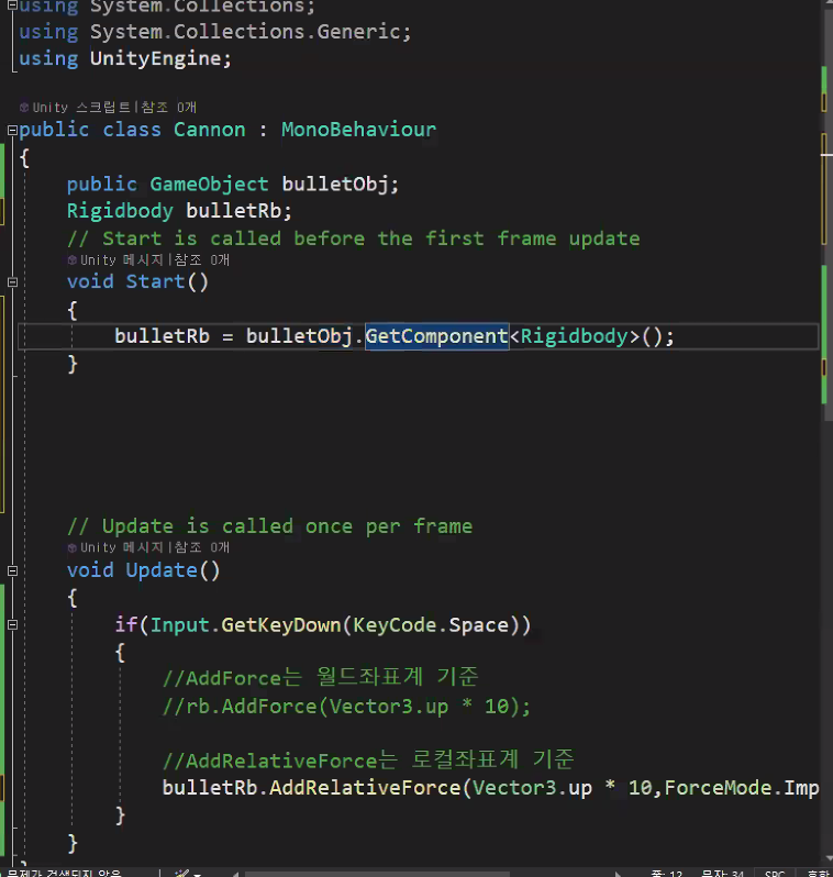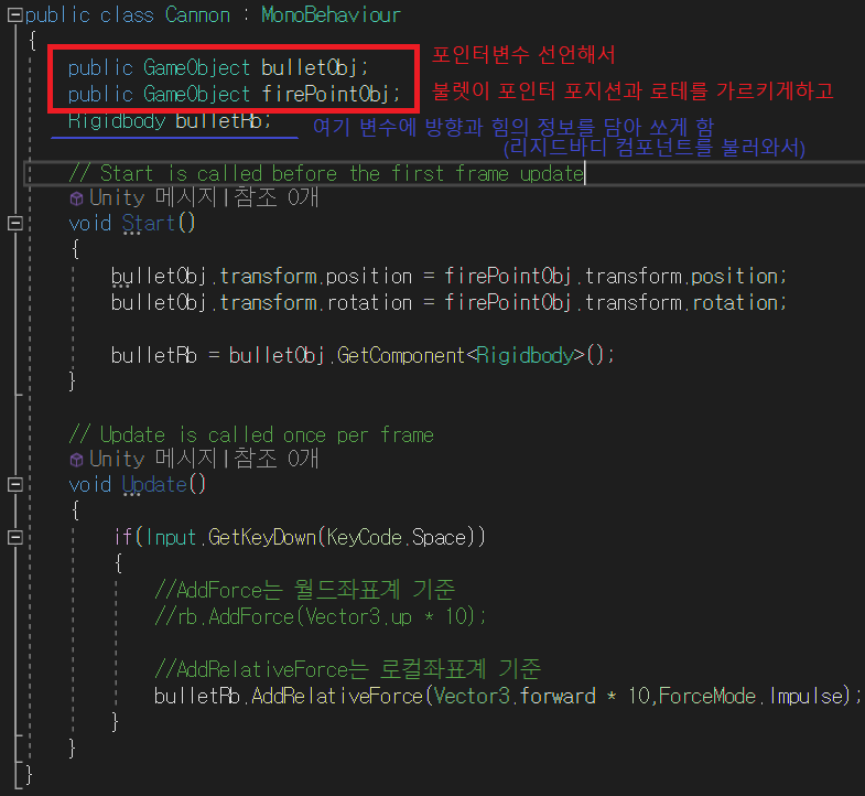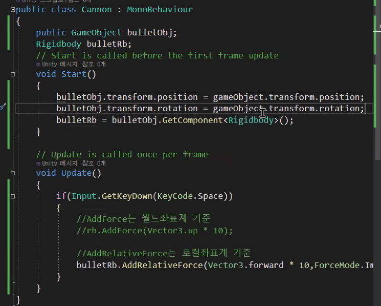 캐논에서 스크립트를 짜서 날릴때 환의 트랜스폰(위치)와 리지드바디 정보가 필요