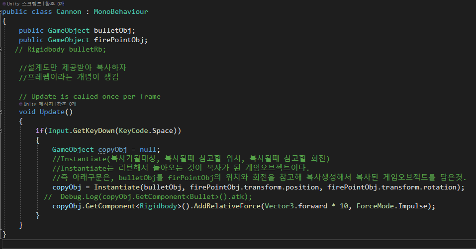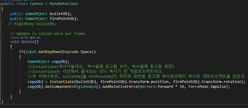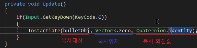 복사 키워드는 Instantiate(복사할 게임 오브젝트);
