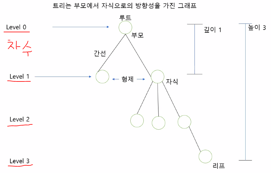 트리는 부모에서 자식으로 방향성을 가진 그래프라서 화살표 방향을 생략할수있다(어짜피 부모에서 자식으로 가는거라)